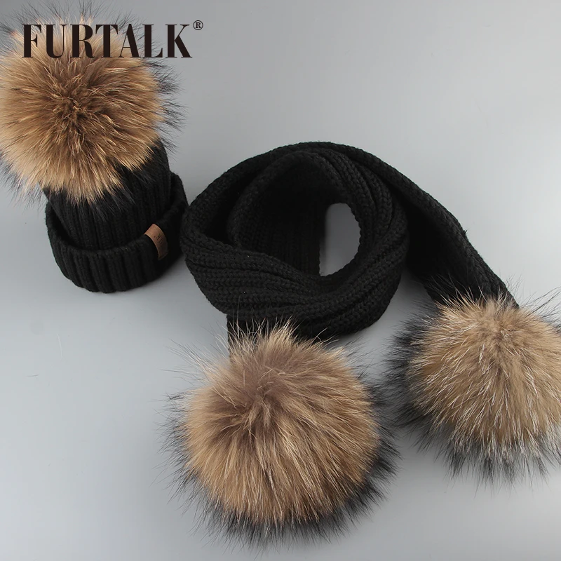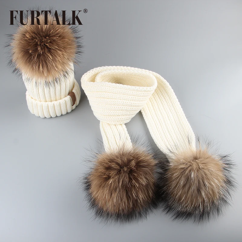 HOT Sale FURTALK Kids Ages 1-10 Winter Baby Real Fur Pompom Hat Scarf Set Knit Beanie Hats and Scarves for C